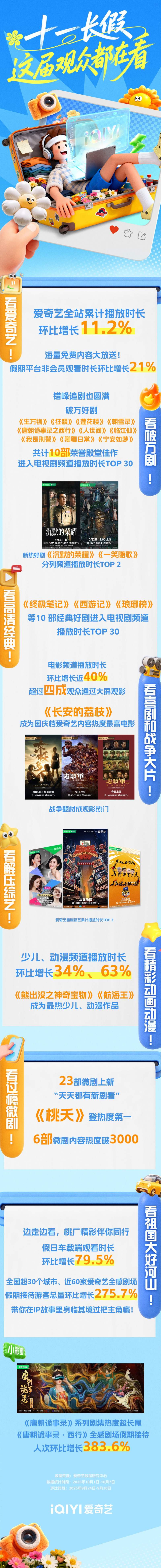 爱奇艺数据研究中心数据显示,2025年国庆假期前7天,平台累计游戏时长较节前一周增长11.2%。剧集方面,除了热门剧《荣耀沉默》、《微笑歌唱》引发“追捧风”外,还有10部剧进入电视剧频道前30名,其中《万物》、《快递》、《大唐西游》等内容热度值均过万。值得注意的是,9月份,该平台开始提供部分片库内容限时免费观看。假期数据显示,非会员在平台的观看时长环比增长21%。 《终极笔记》《琅琊榜》《西游记》等高清经典成为了大家假期里的“度假小伙伴”。热门IP剧长尾价值持续即将上映,国庆假期前7天《大唐西游》影院门票数量环比增长383.6%。电影方面,由于影院密集上映,爱奇艺电影频道观影时长环比增长近40%。 《长安荔枝》以7720的内容热度值领跑,《哪吒之海妖》则延续暑期热度,观看时长位列前五。战争题材电影在国庆假期很受欢迎。 《东方之岛》不仅播放量突破7000次,还带动了《狙击黎明》、《狙击战》、《志愿军:生死战》的播放量。其他方面,综艺、少儿、动漫、综艺节目播放时长环比增长。爱奇艺独立综艺《喜剧之王第二季》、《冲锋姐姐》《e》、《年度喜剧大赛第二季》人气很高,《出没的熊的宝藏》《海贼王》化身“解冻神器”。23部微剧剧将陆续更新,每天一部新剧。其中,《桃夭》最受欢迎,6部微剧热度超过3000人。新华社数据显示,驾驶自动驾驶汽车的游客数量超过3000人。 国庆假期上半年2.4亿人次,“在路上”观影需求持续增长。国庆小长假前7天,爱奇艺车内观看时长环比增长79.5%。