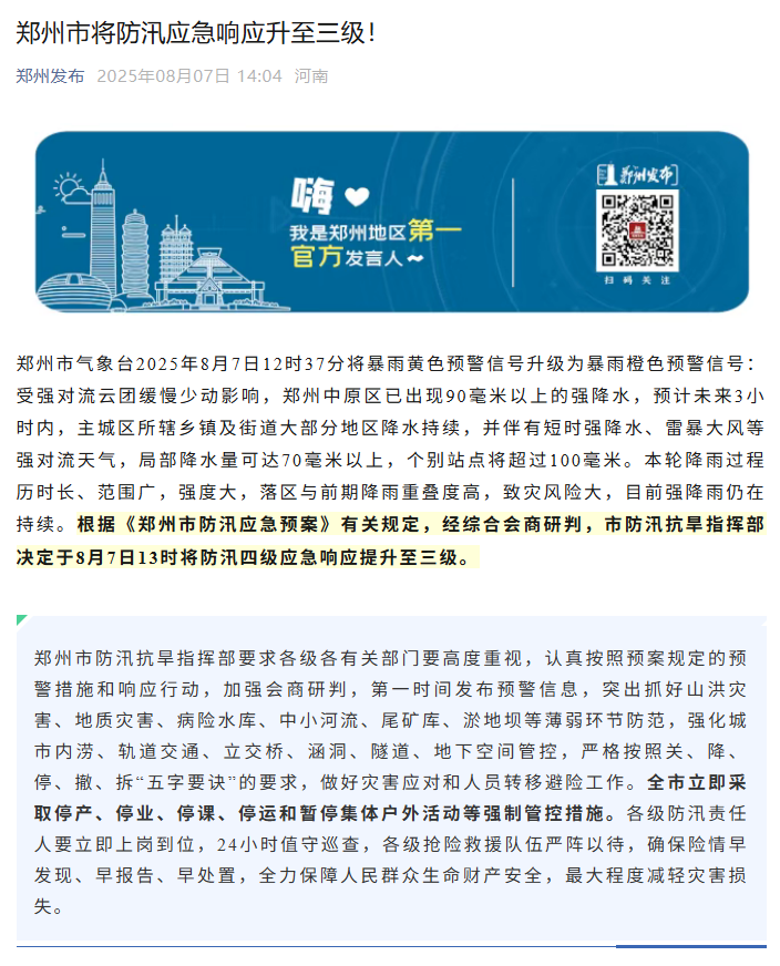 根据郑州微信国际信仰公共帐户发表的消息,郑州气象站改善了大雨的黄色警告信号,升起了强烈的橙色警告信号。预计接下来的三个小时将在主要城市地区的大多数城市和街道上继续下雨,并伴随着强烈的对流气候,例如短期内强烈的降雨,雷暴和强风。局部降水可以达到70毫米以上,其中一些地点大于100毫米。这次降雨持续了很多时间,范围很广,并且得到了加强,在跌落的地区和先前的降水区之间的重叠很高,导致灾难的高风险。仍然有强烈的降雨。在“郑州洪水控制管理计划”的相关规定之后,经过完整的咨询和失败,CO指挥官和干旱的帮助决定于8月7日决定,第四洪水控制指挥委员会将升起至级别第4级至第3级。计划咨询和加强咨询以及预警的早期发布决策,它将重点避免避免薄弱的联系,例如快速的山区灾难,例如山区快速山区的灾难,分散,城市灾难,灾难,灾难,灾难,预警灾难,避免山区散布山区,例如快速的山区,例如山区散布,例如山区散布。预订,中小河流,尾池和淤泥大坝,并改善对城市洪水,铁路运输和区域控制的控制。提示:“清理,减少,暂停,疏散,拆除以及在灾难响应和人员转移和避免中的提示。城市意想会立即采取强制性管理措施,例如停止生产,商务,班级,班级,运营和集体户外活动。预防洪水预防官员应立即努力,应当立即工作,以及所有级别的救援团队,以及所有级别的救援团队,以及所有级别的救援团队。在瓜尔(Guar)上,危险,早期报告,早期设备的早期解剖,避免了生命的安全。